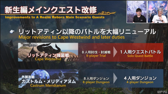『新生エオルゼア』の終盤である「リットアティン強襲戦」はソロで挑むイベントバトルに置き換わり、「外郭」「内郭(魔導城プラエトリウム)」と呼ばれる8人用ダンジョンは4人用に、いくつかのバトルは個別のコンテンツとして分割されます。それに伴い、「メインルレ」と呼ばれているこれらのコンテンツが対象のルーレットにも調整が入る形となります。現在でもかなりの経験値を得られるこのコンテンツルーレットですが、「今よりもめっちゃ(報酬が)不味くならないようにはしていく」と吉田氏はコメント。