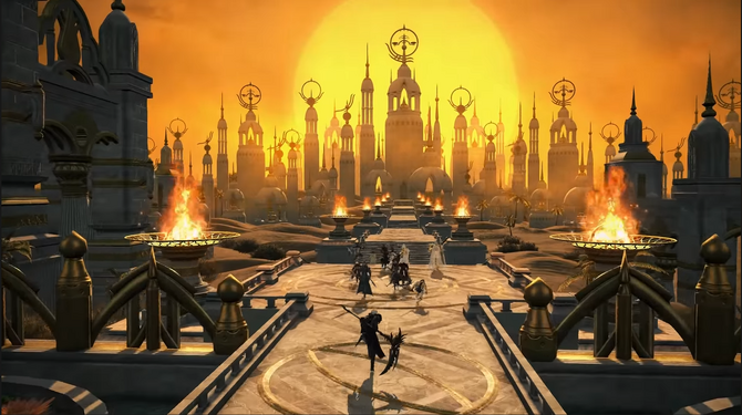 先に公開されたトレイラーや実機でも、エオルゼア十二神と思われるボスの姿などが登場。鉄槌を持っているのは「ビエルゴ」で、見覚えのある巨像は「ラールガー」のものであるほか、燃え盛る扇を持っているのは「アーゼマ」、フィールドの天秤の意匠や、二体の神は「ナルザル」であると考えられます。アライアンスレイドは3つのコンテンツに4体のボスが配置されるので、もしかすると「エオルゼア十二神」全員と戦うことになるのかも知れませんね。