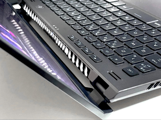 今回試用しているモデルのサイズは「幅312mm×奥行き227mm×高さ19.5~22.61mm」で、本体重量は「1.72kg」。同サイズのノートPCと比べると、おおむね標準的と言える重さです。いわゆる超軽量ボディを謳うマシンには劣るものの、ちょっとした持ち運びに苦労することはありません。先の「AniMe Matrix」との相乗効果で、他人に見せびらかしたくなる仕上がりです。