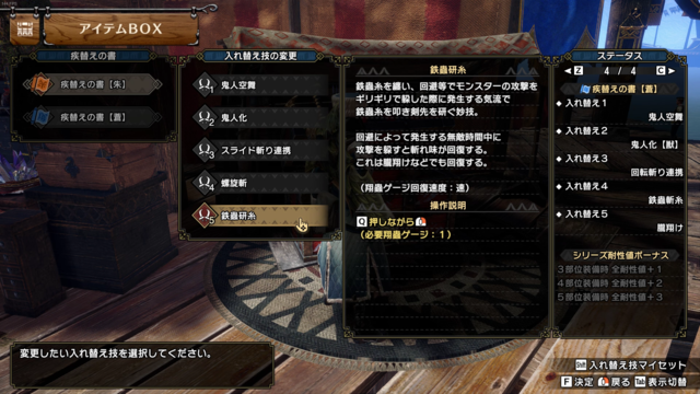 通常技として追加われた「スライド斬り連携」は鬼人空舞のように回避判定を持っている技。「鉄蟲研糸」を積極的に使っていく構成であれば、入れておいて損はないでしょう。回避判定があるので、回避性能に使う部分も減らせます。入れ替え対象は回転斬り。