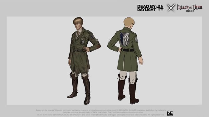 (C) 2015-2022 BEHAVIOUR, DEAD BY DAYLIGHT and other related trademarks and logos belong to Behaviour Interactive Inc. All rights reserved. Based on the manga "Shingeki no Kyojin" by Hajime Isayama originally serialized in the monthly BESSATSU SHONEN MAGAZINE published by KODANSHA Ltd. (C)Hajime Isayama, KODANSHA/"ATTACK ON TITAN" The Final Season Production Committee.