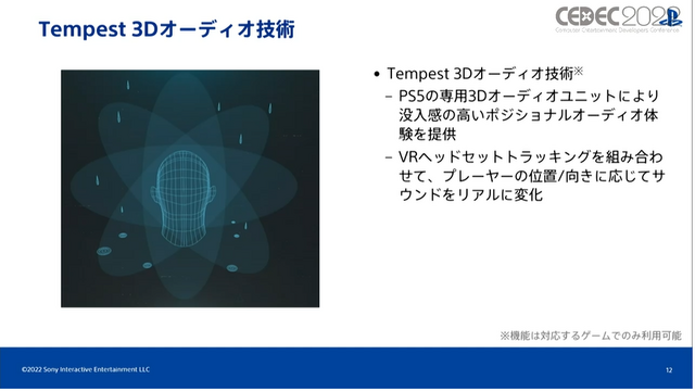 そしてPS VR2にも、PS5に実装されたTempest 3Dオーディオ技術を実装しています。これはVRヘッドセットのトラッキングを組み合わせることで、プレイする位置や向きに応じてサウンドを変化させます。ゲームで耳元に囁く声や、足音で敵味方を区別するなど、こちらもよりゲームの世界に入り込ませる機能となっています。