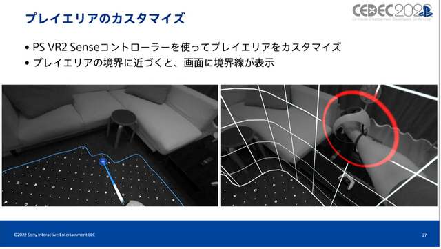 続いてPS VR2のシステムUXについてを高橋氏は紹介します。本ヘッドセットではトラッキングカメラを利用したシースルービューも実装。たとえばヘッドセットを被ったまま、コントローラーを探したいときなどにリアルの空間を映してくれるため、わざわざヘッドセットを被りなおしたりする手間をなくしています。
