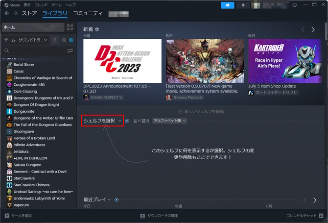 「シェルフ」というのを初めて聞いた方も多いかもしれません。これは何のことかと言いますと、「Steamホーム画面右下の領域」の事です。