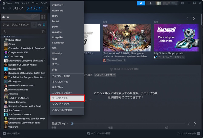 これで、追加したシェルフが「プレイネクスト」欄に変わります。これはプレイヤーの遊んでいるゲームの傾向に応じて、Steamクライアントがプレイヤーの好みを推測してライブラリの中から次に遊ぶゲームをおススメしてくれる機能です。Steamのセールで膨大にゲームを購入してしまって次に遊ぶゲームに悩んでしまう……という方も少なくないと思いますが、そういう方にこそこの機能を試していただきたいと思います。