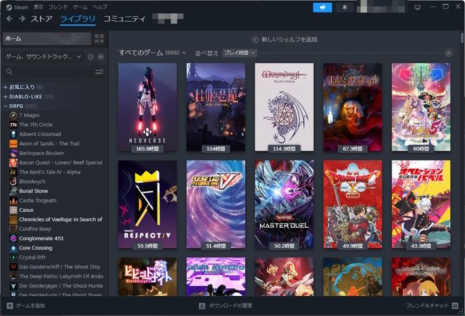 「すべてのゲーム」シェルフは、文字通り所持しているすべてのゲームを表示するシェルフです。なお、この項目の並べ替え順を「プレイ時間」に指定すると各ゲームのプレイ時間も合わせて表示されるので、「俺は何百時間もこのゲームをやったぞ!」という自慢(?)にも使えます。
