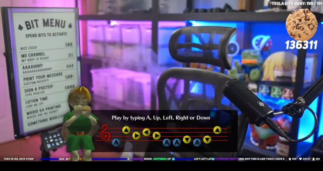 Twitchのチャット欄にA・Up・Left・Right・Downと書き込むことでリンクがワードに応じた音を演奏してくれます。また、実際に『ゼルダの伝説 時のオカリナ』に存在する「サリアの歌」や「エポナの歌」などの音階を完成させることで楽曲を“通し”で演奏してくれる機能も搭載。