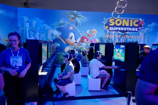 Sega Europeのブースでは、タイミングが合えば着ぐるみのソニックがお出迎えしてくれます。10月発売の『ソニックスーパースターズ』が最もスペースをとっており、欧州のソニック人気を物語っています。実際、ONLでも『ソニックスーパースターズ』の新PVが発表されたときの会場は大盛り上がりでした。