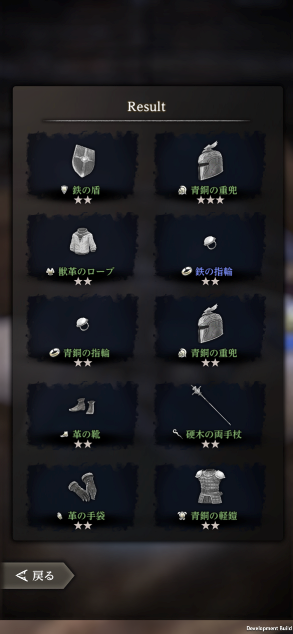 拠点に戻ったら、迷宮内で見つけた「ガラクタ」を復元して装備アイテムを入手することができます。手に入るアイテムの中には時折色違いのアイテムが混じることがあり、こういったアイテムには様々な能力アップなどの特殊効果が秘められています。同じ名前の装備品でも性能が違う……といった点は、『ディアブロ』に近いでしょうか。