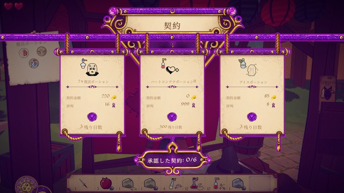 特定の住民からは、クエストが発生することもあります。クエストは必要なポーションを持っていくものが基本ですが、なかには「町での人気を集めたい」という悩みに対して、香水や惚れ薬といった複数の解決法をプレイヤーが選択するものも。クエストや契約をクリアすることで、お金や評判を獲得し、評判によって店で購入できる物が増え、さらに錬金術の幅が広がります。