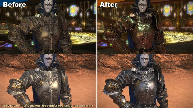 以前から継続的に情報の公開されている「グラフィックアップデート」も経過が報告され、今回は前回の発表からフィードバックを受けた、「アウラ族」についての説明などがありました。従来のものでは角や鱗などの質感にエナメルのような「テカリ」が見られていましたが、フィードバックを受けて少しマットな質感に。