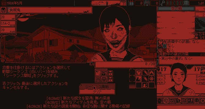 校内の探索を続けていると、怪異とエンカウントしてターン制のコマンドバトルが始まった。バトルでは、素手や武器による攻撃が可能だ。手に入れたばかりの木製バットでボコボコにしてやるぜ!