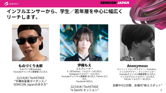 そして、この「SEMICON Japan」では2022年からeスポーツ界で活躍するインフルエンサーを招いての「eスポーツ×半導体」と銘打ったセッションがスタートしており、今年も12月14日に「No 半導体、No GAME」を掲げるセッションが予定されています。