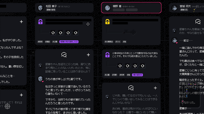 清崎は捜査の過程でさまざまな関係人物から証言を得ましたが、時が経ち、清崎自身もその記憶に苦しみ、あまり思い出したくない様子。そのため、清崎が覚えている会話は、時系列も、話者も、それが真実かどうかもごちゃごちゃの状態です。プレイヤーの役割は、話題を整理したり思い出させたりしながら、事件の真相を突き止めることです。