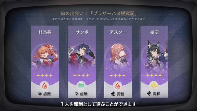 ピノコニーの「夢境ショップ」で特殊な夢の泡に触れることで、異なる夢の世界を体験できます。クロックボーイと同じ人気アニメキャラクターのブラザーハヌにフォーカスするイベント「ブラザーハヌの脱獄記」の舞台では、監獄長がスラーダを禁制品として扱っている様子。プレイヤーは開拓者として囚人仲間の脱獄を手助けするストーリーが描かれます。イベント報酬として、「桂乃芬」「サンポ」「アスター」「御空」の中から1人を報酬として受け取れます。