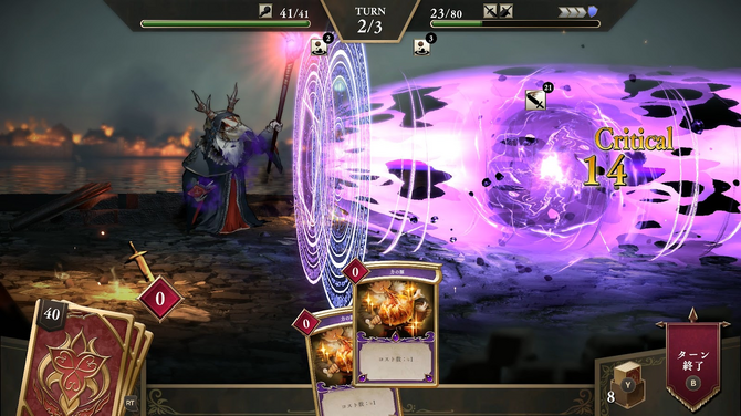 しかも、コストが残っているかぎり、1ターンに何度も行動できるカードバトルということで敵の攻撃もかなり強烈。ザコ敵に1発で半分近く削られるのも珍しくないので、手札の引き次第では、一度の戦闘でどちらかが絶命するのが本作の日常でした。