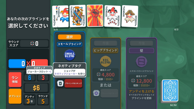 プレイヤーに課される不利な条件の例としては、「特定のスートのカードの効果が封印される」「ひとつの役しか使用できない」「逆に一度使った役は通じない」「目標スコアは低いが、1手でワンショットキルを決めなければならない」「目標スコアが異様に高い」など、様々な条件が課されます。「ボスブラインド」をクリアするとアンティが1段階上がり、さらに目標スコアが跳ね上がったスモールブラインド・ビッグブラインド・ボスブラインドに挑むことになります。