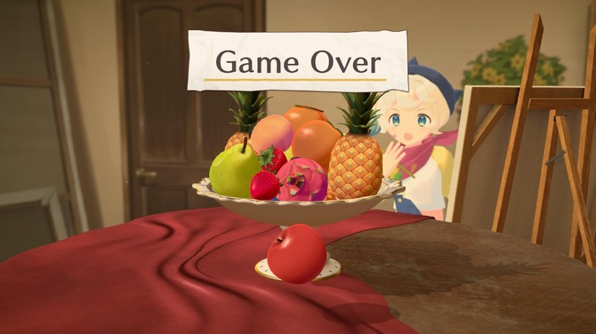 本作は、アトリエで絵を描く女の子に眺められながらフルーツを積み上げていくパズルゲーム。プレイヤーは、角度や位置を調整してお皿にフルーツを積み上げていきます。フルーツがお皿から落ちるとゲームオーバーです。
