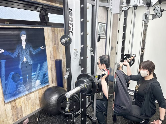 この度デモンストレーションが実施された秋葉原ジムでは、様々なイケメンキャラクターのグッズがびっしりとディスプレイされていました。その中にはジムのクラブ会員が提供した推しキャラグッズもたくさんあるとのこと。推しとキャラ愛が深く感じられるジムの内観です。