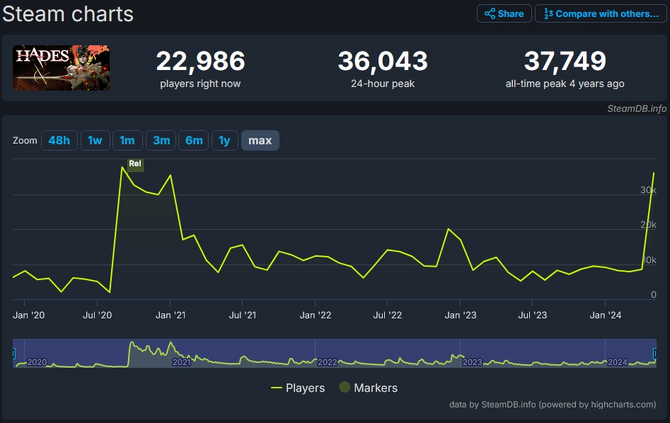 前作『Hades』のデータと比較すると、こちらは最大ピーク時の人数が37,749人となっており、『Hades II』は現時点で前作の約3倍のユーザーが遊んでいることになります。