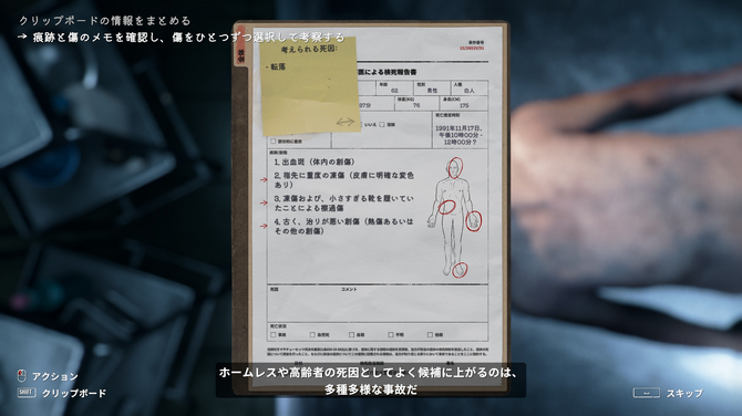 本作は「検死」というテーマを扱っているため、記事内には血や内臓、欠損部分が写ったスクリーンショットを多用しています。