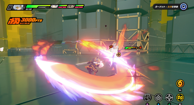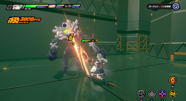 小さな身体で、円状に回転するチェーンソーを振り回すメイドさん。武器が武器なのでザクザク手早く斬るタイプではないものの、姿勢を維持してチェーンソーを多段ヒットさせるのが快感です。連続ヒット自体は簡単な操作で行えるので、隙あらば繰り出したくなる常習性にヤラれました。