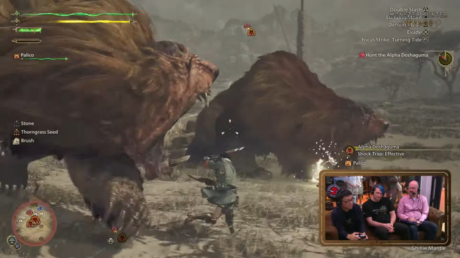 「Developer Livestream Day2」では辻本良三氏、藤岡要氏、徳田優也氏の開発陣にくわえ、Jonno Stanton氏の4人でマルチプレイのクエストに挑戦していました。クエストの対象となる大型モンスターは群れで行動していることもあり、乱戦を避けるため群れから引き離す行動が重要です。また、モンスターが複数体集まると群れを形成し、BGMが変化する場面も。