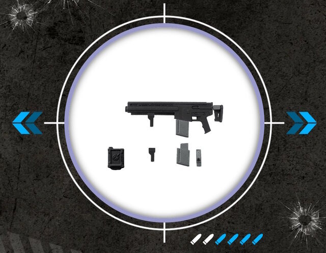 本商品は、ニケたちの使用する武器を1/12スケールの手のひらサイズでプラモデル化したもの。スコープ・グリップ・マガジンの着脱ギミックや他の武器との互換性、キャラクターごとにバーストマニュアル・スキルマニュアルのパーツも付属しています。