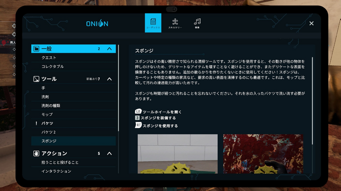 また、「コーデックス」というチュートリアルを兼ねたデータベースが充実していて、アクションやツールがどんな機能を果たすのかを教えてくれます。例えば、基本動作の「物を拾う/投げる」は掃除の邪魔になるオブジェクトを掴んだり、元にあった場所へ家具を配置したりできます。ゲームが進行する都度、コーデックスが更新されるので非常に便利です。