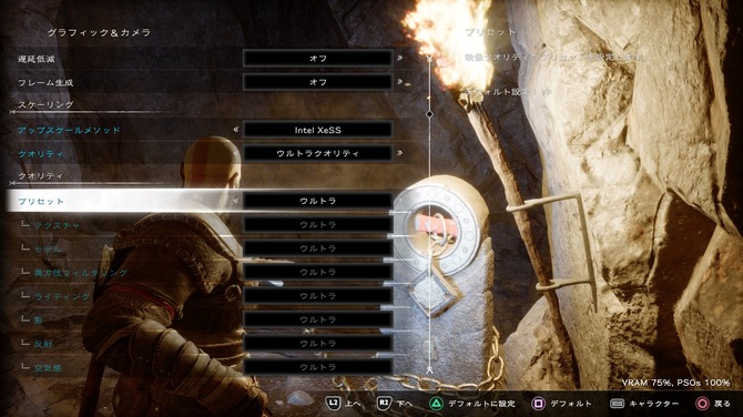 というわけでこちらが本作のグラフィック設定画面です。プリセットで4段階の画質設定が一括変更できるのはもちろん、テクスチャや光と影の描写、霧などのエフェクト等様々な項目を個別に設定することも可能になっています。また、同じSIEタイトルである『Horizon Forbidden West』のPC版と同様に、変更内容が即座にゲーム画面へと反映されて確認できるようになっており、初めてこの機能を使う筆者は大変画期的に感じました。