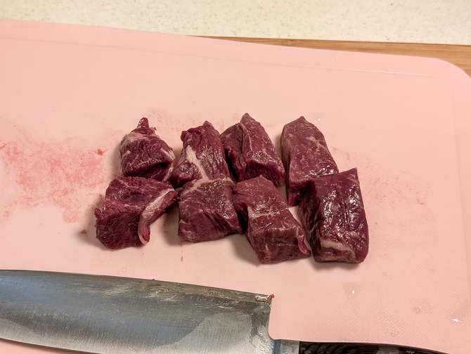 冷凍で届いたので、解凍したのちにゴロゴロっと存在感のあるサイズにカッティング。