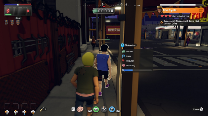 アンダーシティからロックヘブンに出ると広大なオープンワールドになっていて、無数の住民がそこらへんを歩いています。近づくと「スリ難易度」や「裕福度」「戦闘力」などNPCの各情報が表示され、これを基準に誰を狙うか決定します。