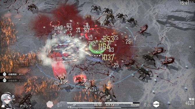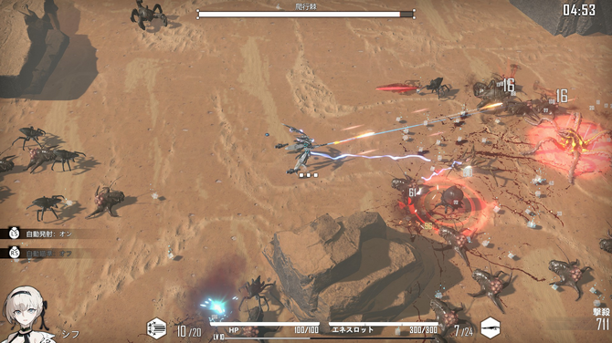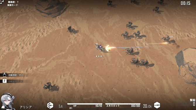 ゲームは『Crimsonland』『Vampire Survivors』といった作品からインスピレーションを受けて制作されています。プレイヤーは砂漠や氷の世界を舞台に、周囲から無数に押し寄せる虫型の生物を相手に、個性豊かな武器や能力を持つメカを強化しながら立ち向かいます。