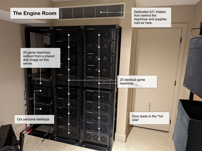 地下室のエンジンルームには20台のゲーム用PC、そして家族の個人用PCとゲームシェア用のサーバーが用意されており、空調も行き届いた部屋となっています。