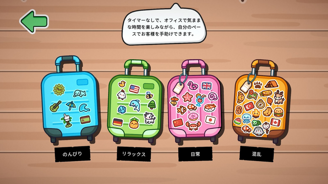 まずは四段階ある難易度を選択する。一番簡単な「のんびり」の難易度は、時間制限なしにのんびり遊べるようだ。おそらく左から、ベリーイージー、イージー、ノーマル、ハードくらいの振り分けかな。ノーマル難易度っぽい「日常」でプレイしてみよう。