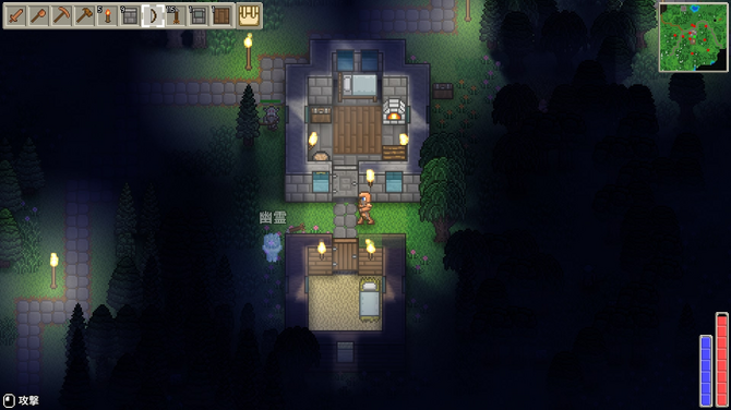 NPC用の部屋は床と壁で囲み、ベッドと光源を置くことで建築できます。定住したNPCからはアイテムが購入できるほか、冒険や生活のヒントなどを聞くことができます。ゲームが進めば鍛冶職人や農学者などのNPCが増え、生活もどんどん拡大していくようです。