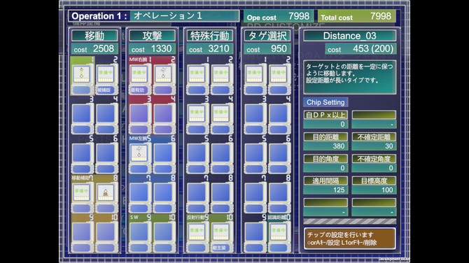 ミッションや対戦では構築されたロジックパターンに沿って自律して戦闘を行う無人機体「BD」(Battle-Doll)を利用できます。移動や攻撃といった4つのカテゴリにオペレーションチップを配置し数値を設定すると多種多様な戦闘パターンを実行させることが可能です。進捗報告版ではBDのみでミッションに出撃するオペレーターモードをオフラインの模擬戦で楽しめます。