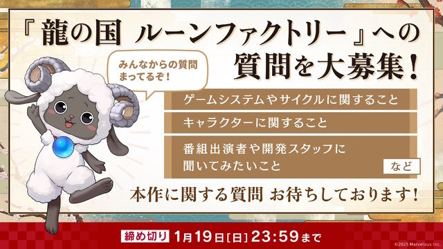 また、1月22日20時より「ルンファクチャンネル~#龍ファク 予約開始記念番組~」の配信が決定しました。初の実機プレイや最新情報をはじめ、事前応募した質問に前川ディレクターが回答するコーナーも用意。質問は応募フォームにて1月19日まで募集しています。