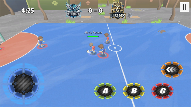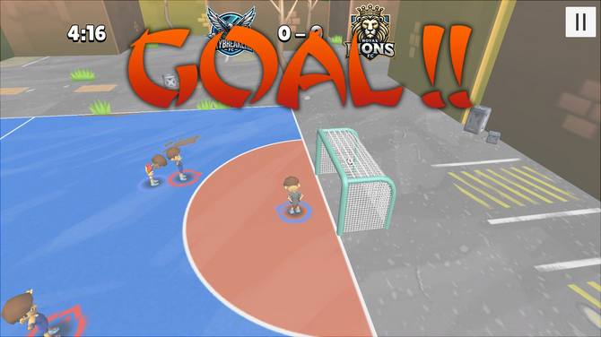 ゲームとしては、シンプルな3on3のサッカーゲーム……って、全員顔同じじゃねーか!(「こち亀」を思い出す筆者)