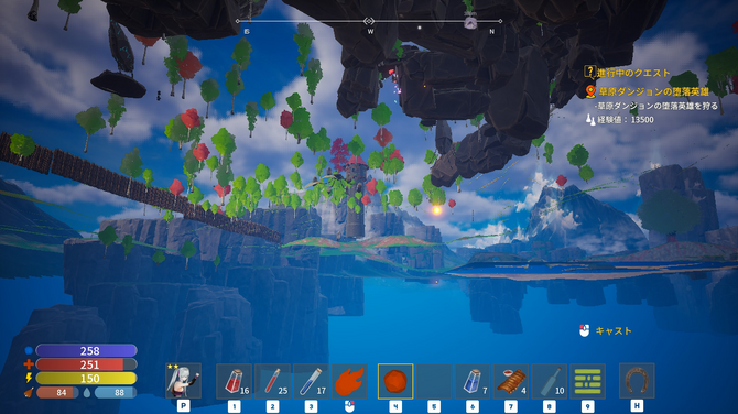 UIでは、方角を示すコンパスの目標が分かりづらいのも気になるところで、マップ自体も決して見やすいものとは言えません。序盤から「スカイタウン」に降り注ぐ隕石の影響でゲームが重い、シンプルに世界が暗い、Escキーでクラフトやインベントリ画面から戻れない(中断メニューが出てしまう)など、さまざまな面で冒険やクラフトの楽しさを損ねてしまう部分も気になります。