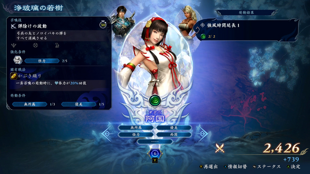 あとは、変わったところであげると、「戦国無双」のお市阿国ですね。お市は固有戦法を発動すると一度だけ復活できて、阿国は一斉召喚を発動すると体力が20%回復します。本作は回復手段が少ないので、どちらも発動条件を揃えられれば大きな助けになります。