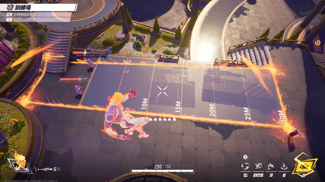 「フレイムメテオ」は地面に飛び込み敵を大きく吹き飛ばすスキルで、スタンさせる効果も発生します。HPが削れた相手を追い詰めたり、高台の敵を吹き飛ばして落としたりと多様な攻撃手段として機能する他、緊急時の退避手段としても活用可能です。