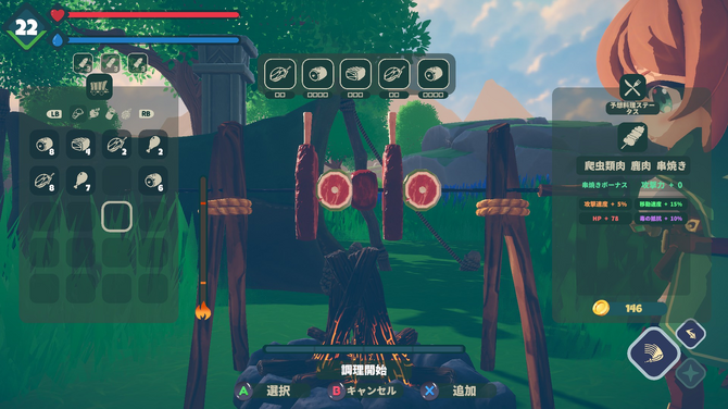 食事の効果は非常に高く、HPや攻撃力、移動速度といったものから耐性などにも関わってきます。料理は3種類まで同時に摂ることができ、それぞれ効果も得られるので、美味しい料理をたくさん作れば驚くべきパワーを得られるのです。なるほど、これが神々が禁じた力か……!