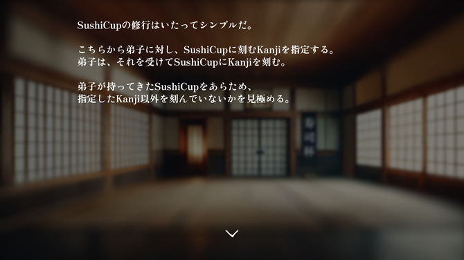『SushiCup Legend』ではプレイヤーはSushiCupMasterとなり、伝統の技術を継承すべく弟子が作ったSushiCupに漢字間違いが無いかを確認します。間違いがなければ「良し」、間違っていれば「悪し」と判断し、一人前のSushiCup職人へと育て上げていくのです。