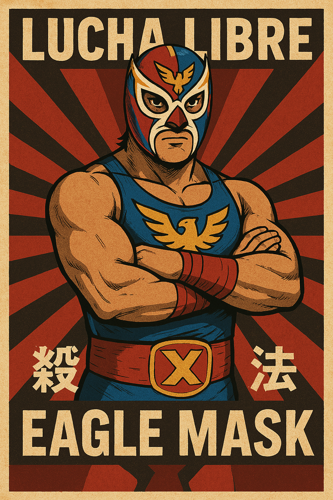 おわびに、本稿でボツになった「“X殺法の使い手”であるメキシコのルチャ・リブレ、イーグル・マスク氏」のChatGPT生成の画像を置いておきます。ボツの理由は「テンション上げて生み出したけど、完全にノイズだし変に議論呼びそうだし……そもそも面白いか?」との理由です。ゲーミング歌人は賢明な判断もできるのです。
