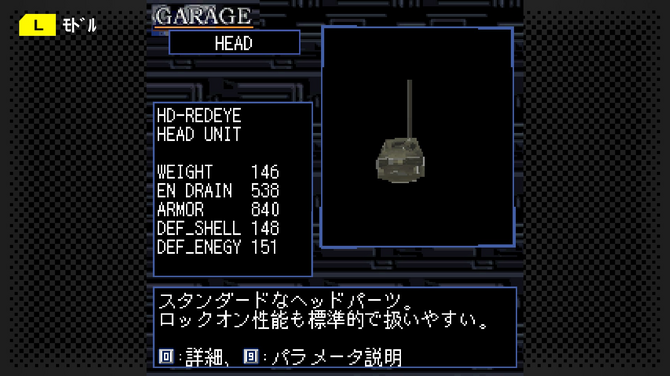 メインメニューのガレージでは、プレイヤーが使用する期待のアセンブルを行えます。パーツはヘッド・コア・アーム・レッグ・ジェネレーターの5種類と、両手両肩の4つの武器で、合計9ヶ所を付け替えられます。各パーツには防御力やそれぞれの特徴がありますが、重量オーバーすると装着することができません。