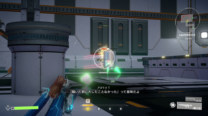 基本操作はいわゆるTPSのスタイルがベースとなっています。WASDで移動し、マウスエイムからの左クリックで射撃。ゲームパッドも利用可能です。敵を画面中央の白い◯の中に入れ、かつ適正距離なら敵に赤丸が表示されます。その状態なら敵に向かって射撃が飛んでいきます。完全にクロスヘアの中心に敵を捉えなければいけない!ということはなく、エイムシステムはかなり優しいため、そのぶん回避へ意識を向けることができます。
