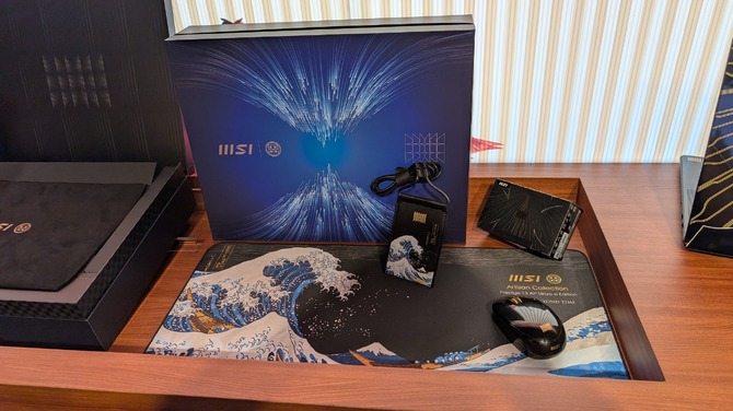 また、少し毛色の違う展示として話題を呼んでいたのが、「Prestige 13 AI+ Ukiyo-e Edition」。日本の山中漆器とのコラボにより、葛飾北斎の『神奈川沖浪裏』をモチーフとしたデザインは、もはやアートの域です。