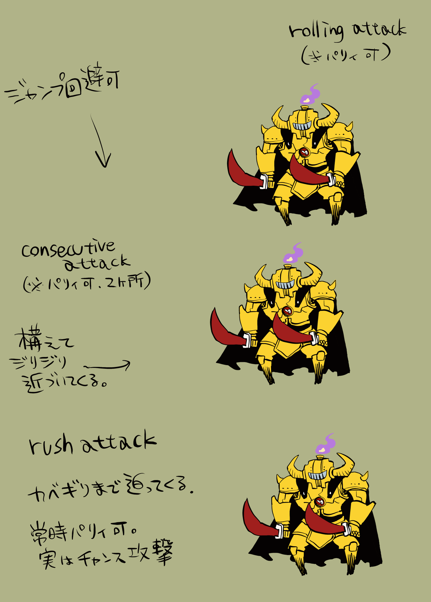 他には「どんぐりパリィ」という『ブラッドボーン』の「銃パリィ」のようなパリィ方法を考えていました。この要素を入れることで水銀弾・輸血液マラソンのように労働でどんぐりマラソンをすることになって面白いぞ……!と思ったのですが、どんぐりを投げるアニメーションを描いてみたものの、どんぐりの軌道や投げて当たるまでのラグがなんかうまく画にならず、そもそもどんぐりが当たるとスタンするってどういう理屈…?となりボツにしました。