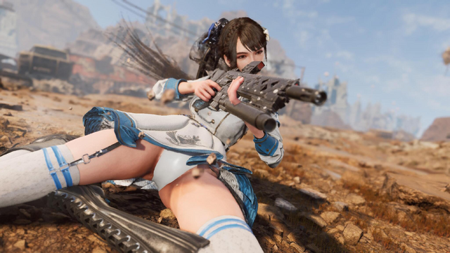 遮蔽物に隠れつつ、敵に照準を合わせ、身を乗り出して撃ち抜く。このワードだけで察する人も多いかと思いますが、このバトルは『勝利の女神:NIKKE』をモチーフとしており、さながら『勝利の女神:NIKKE』の世界にイヴが迷い込んだかのようです。
